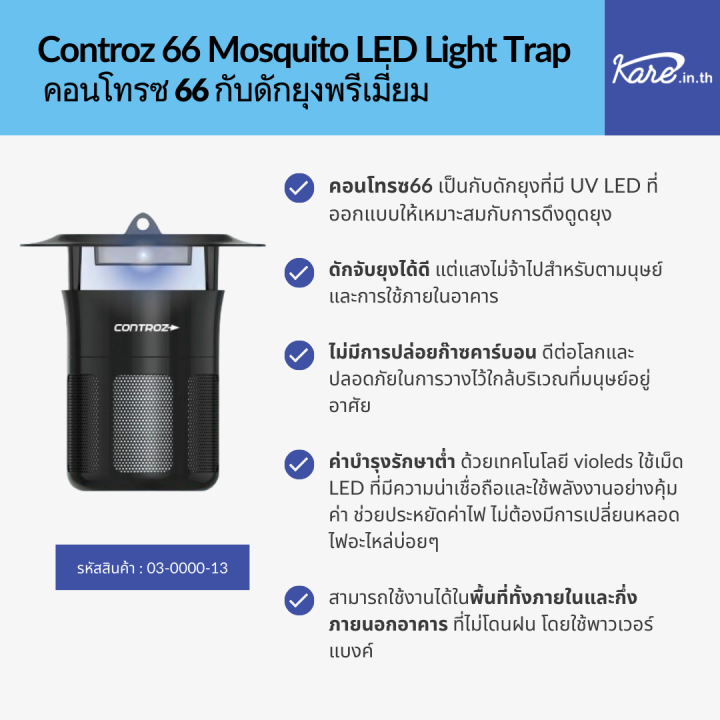 ดักจับยุงตลอดเวลา 24 ชม. UV LED ที่ออกแบบให้เหมาะสมกับการดึงดูดยุง ยังดักจับยุงได้ดี แต่แสงไม่จ้าไปสำหรับตามนุษย์และการใช้ภายในอาคาร ยุงที่กำลังบินอยู่ไม่สามารถต้านทานการดึงดูดได้ ไม่มีการปล่อยก๊าซคาร์บอน ดีต่อโลก ปลอดภัยในการวางใกล้บริเวณที่มนุษย์อยู่อาศัย เมื่อเทียบกับเครื่องดักยุงอื่นๆ ประสิทธิภาพดีกว่าประมาณ 5 เท่า ไม่มีสารเคมีกำจัดแมลง สามารถใช้ในพื้นที่ภายในอาคารและภายนอกอาคารที่ไม่โดนฝน โดยใช้พาวเวอร์แบงค์ ค่าบำรุงรักษาต่ำ เทคโนโลยี violeds ใช้เม็ด LED ที่มีความน่าเชื่อถือและใช้พลังงานอย่างคุ้มค่า เพื่อประหยัดค่าไฟและไม่ต้องมีการเปลี่ยนหลอดไฟอะไหล่บ่อยๆ จัดการยุงโดยทำให้ยุงแห้งตาย ขนาด 200 mm (O) x 232 mm (H) การใช้งานครอบคลุมพื้นที่ 2,000 ตารางเมตร (0.5 acre)